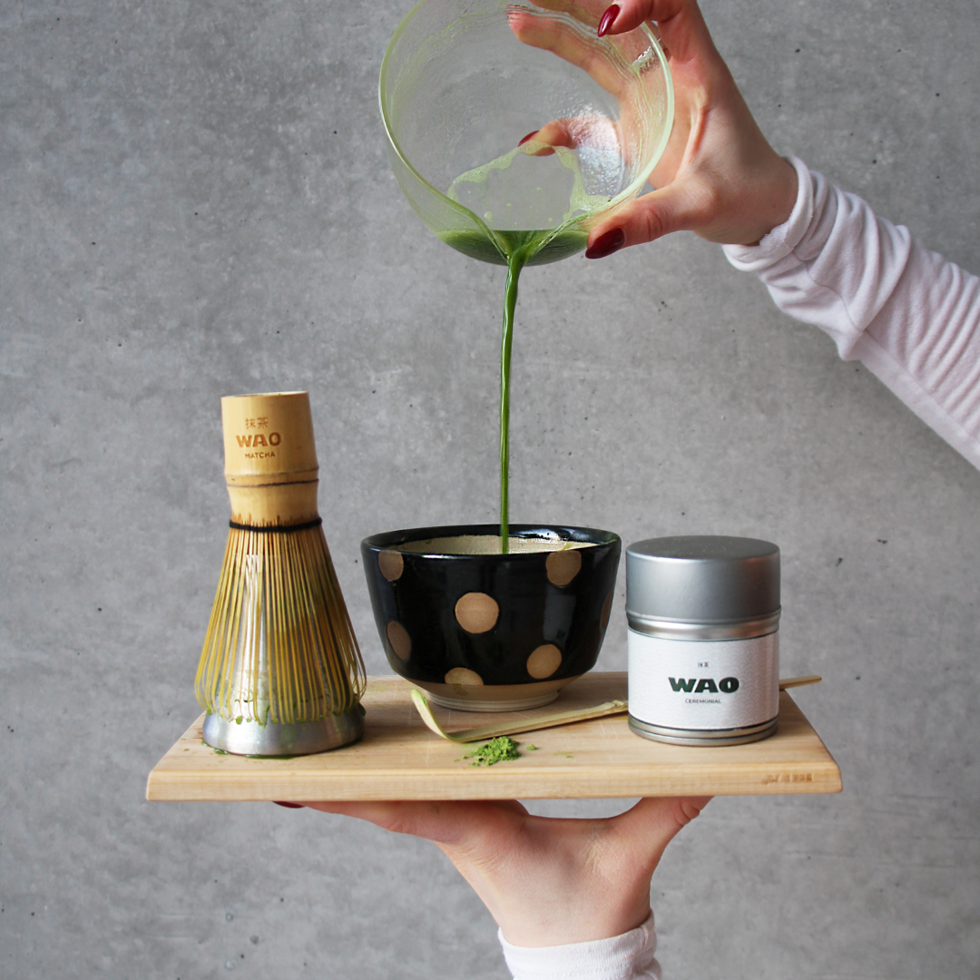 En kombination av en matchaskål och mugg, designad för att du ska kunna aktivera och dricka i samma form.
